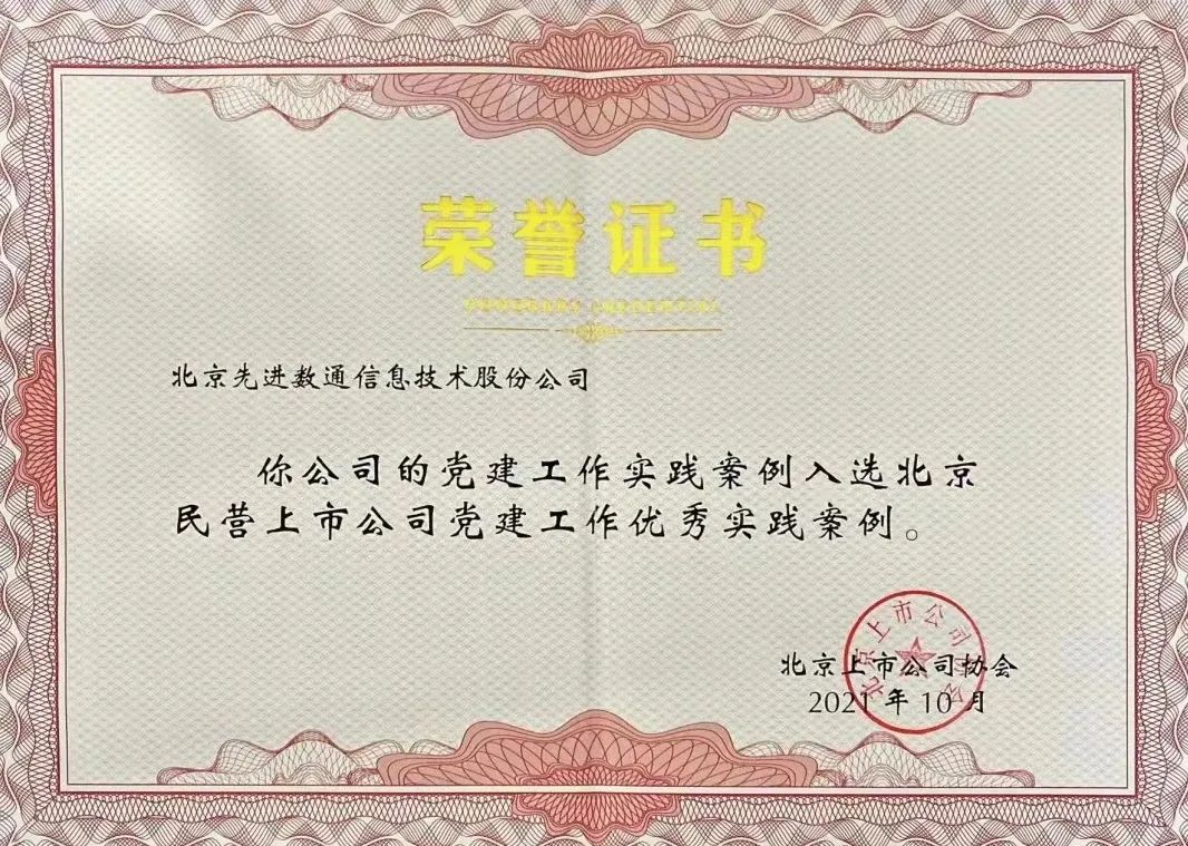 近期,北京上市公司协会授予北京PA真人视讯信息技术股份公司荣誉证书,PA真人视讯党建工作实践入选北京民营上市公司党建工作优秀实践案例,相关党建活动已收录在《北京民营上市公司党建工作优秀实践案例汇编》。